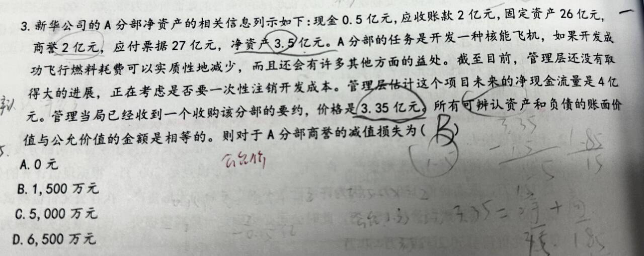 同学你好,①当某项持有资产的公允价值低于其账面价值(含商誉部分)的时候,就有可能出现商誉的减值。商誉减值损失=商誉隐含公允价值-财务报表中账面价值。隐含商誉=某一单位的公允价值-可识别的净资产。②这道题目,可识别的净资产=0.5+2+26-27=1.5。隐含商誉=3.35-1.5=1.85。而账面上的商誉是2,所以商誉减值=2-1.85=0.15亿元。
