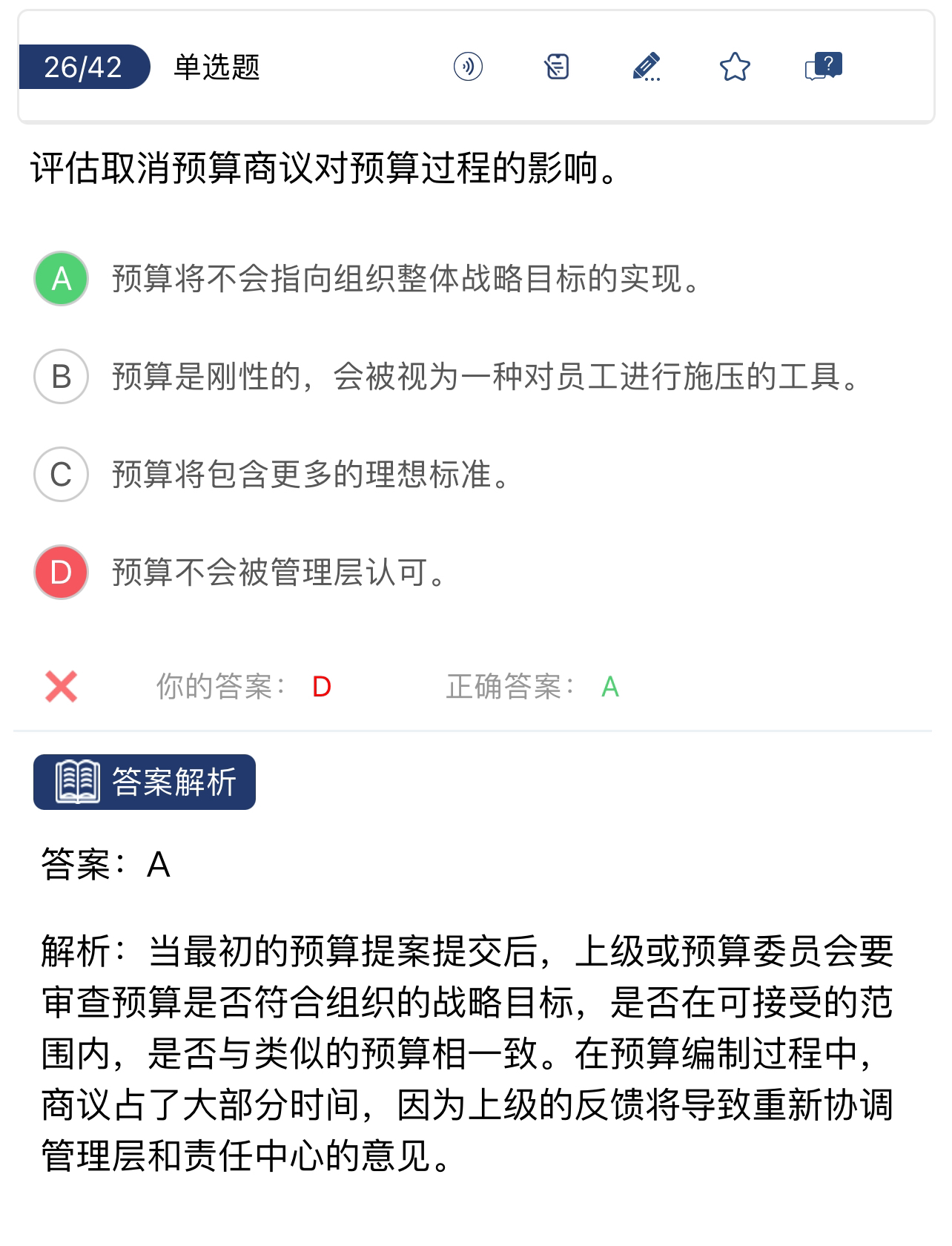 同学你好,那我们需要看一下预算商议的内容。预算商议是指将预算提案呈交管理层或预算委员会后,需要审查预算是否符合组织的战略目标,是否在可接受的范围内,以及是否与类似的预算相一致。所以如果不实施预算商议,可能会出现的问题是预算不符合组织的战略目标。这类型的题目需要根据考察的具体内容来考虑。