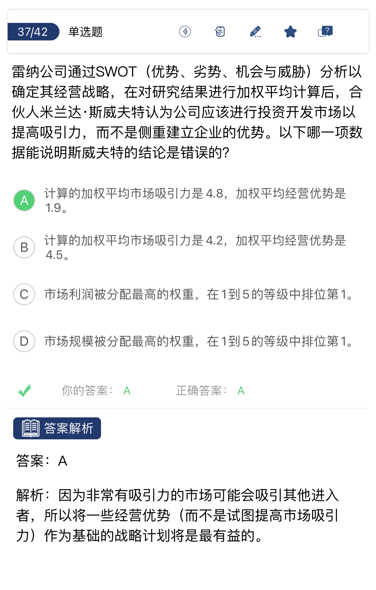 同学你好,①斯威夫特的观点是:投资开发市场提高吸引力,而不是侧重建立企业自身优势。但是A选项里:计算的加权平均市场吸引力是4.8,加权平均经营优势是1.9。在这种情况下,企业所在市场是极具吸引力的,但是企业自身的竞争优势差,所以需要的是提升企业自身的竞争优势,而不是着重去扩宽市场。所以与斯威夫特的观点相矛盾,所以选择A选项。②这个数值越高,说明该方面的优势越明显。