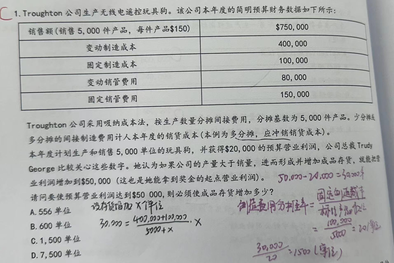 同学你好,①因为这道题目考察的是吸收成本与变动成本之间的差异部分,吸收成本可以把固定制造费用分摊到期末存货里面,所以这里计算的就是固定制造费用。变动制造费用直接计入存货成本,且不是两种成本之间差异原因。②题目中给到的信息:"公司基于生产的数量使用吸收成本法配置制造费用,生产活动量水平为5000个单位",所以使用5000