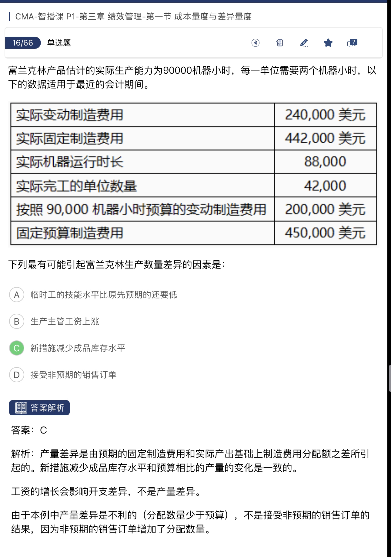 同学你好,①产量差异指的是固定制造费用的产量差异。产量差异=预算固定制造费用-吸收成本法下的固定制造费用。吸收成本法下的固定制造费用=标准分配率×实际工时下的单位固定制造费用。计算出题目中的产量差异=450000-(450000/90000×88000)=10000,所以是不利差异。②”新措施减少了成品库存水平“,那也就是实际作业水平是低于预算产能的,产能存在浪费,同样是不利差异,C选项的变化与题干差异一致。