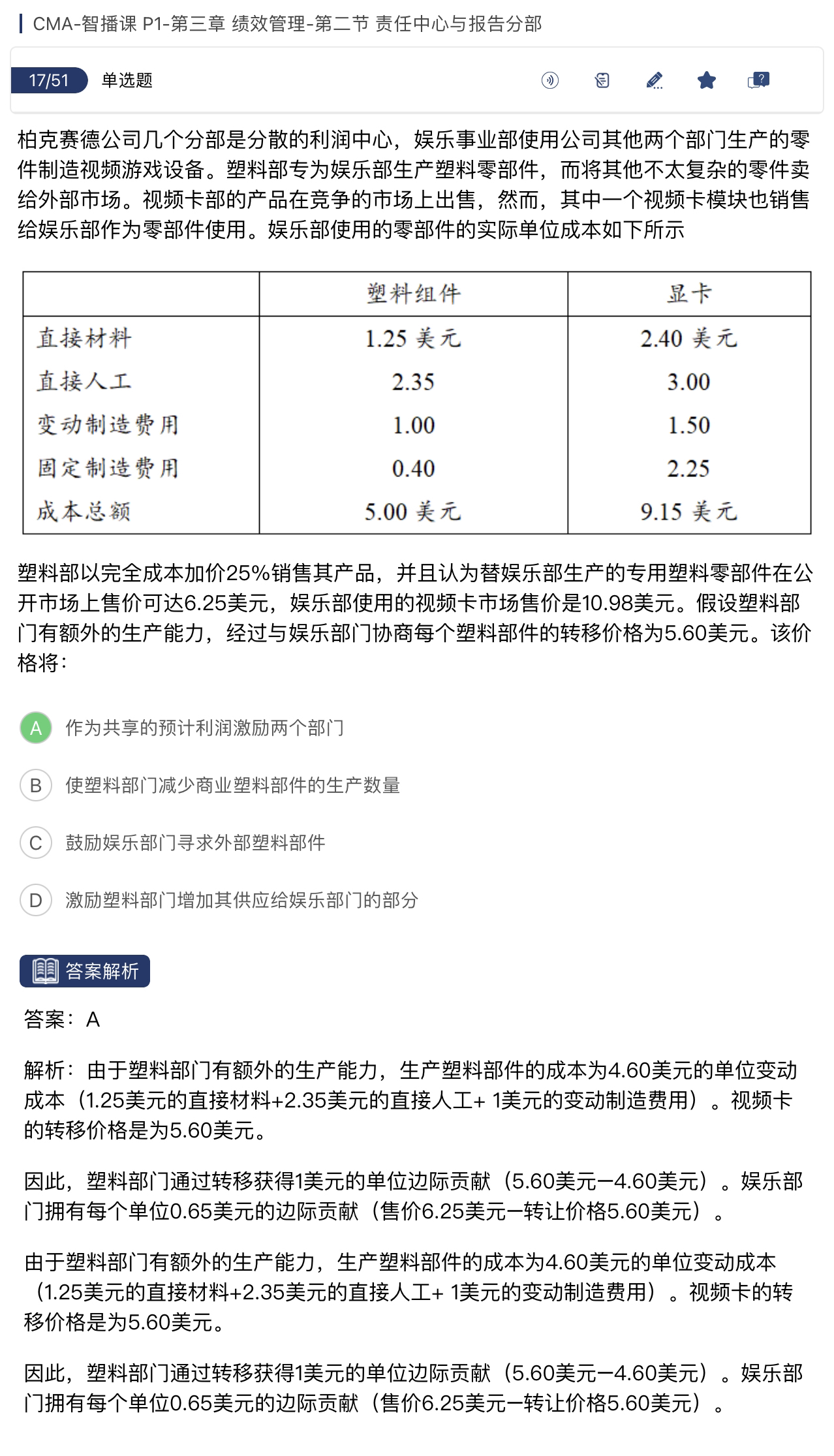 ①问题:部门之间的转移定价,将价格定在5.60美元,对两个部门的影响是什么?②解析:娱乐部门从市场上购买的市价为10.98,而内部转移价格,也就是从内部购买的价格是5.60,内部转移价格低于市场价,所以娱乐部门是非常同意转移价格的。③塑料部门有额外的生产能力,所以高于变动成本的价格都可以接受。塑料部门的变动成本=4.6。转移定价是高于变动成本的,所以塑料部门也是接受的。该转移价格同时激励两部门生产。