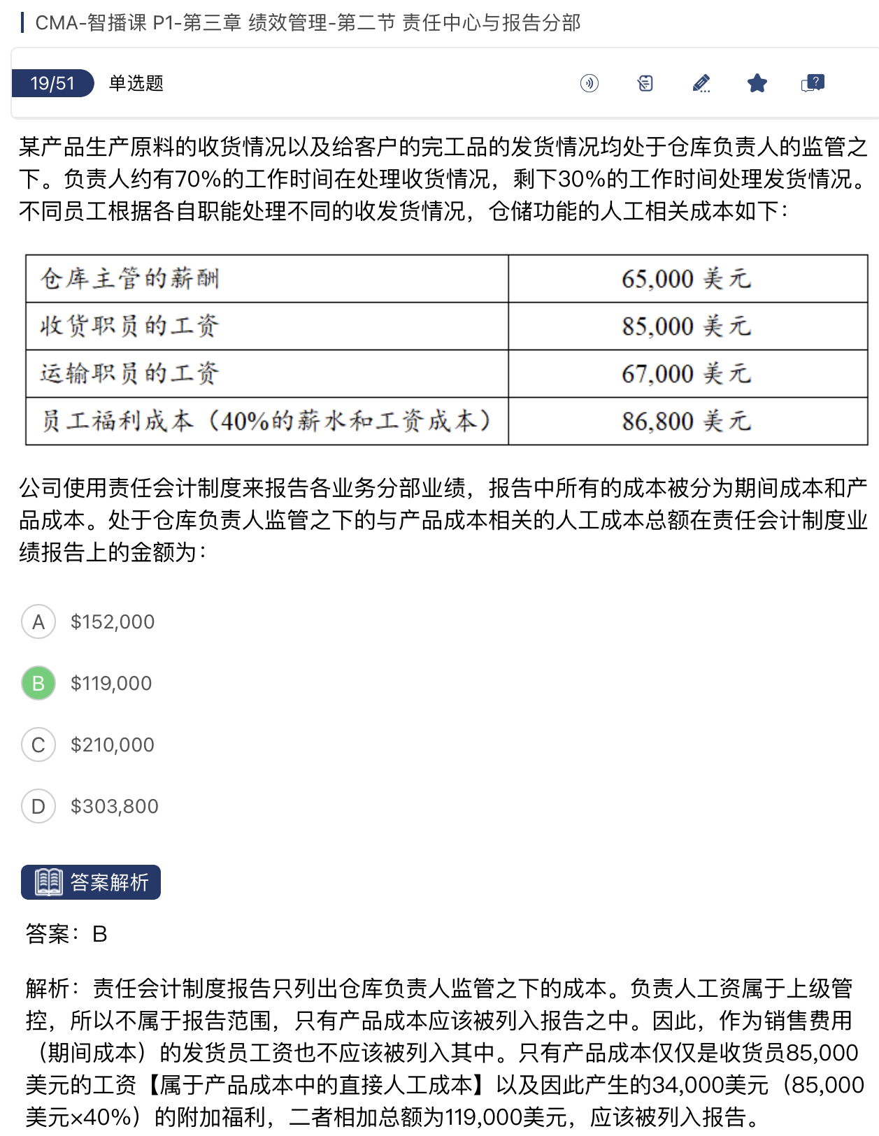 员工福利是40%的工资,与这个以及业绩报告相关的成本是收货职员的工资,所以相关的福利金额也是收货职员的福利金额=收货职员工资×40%=85000×40%