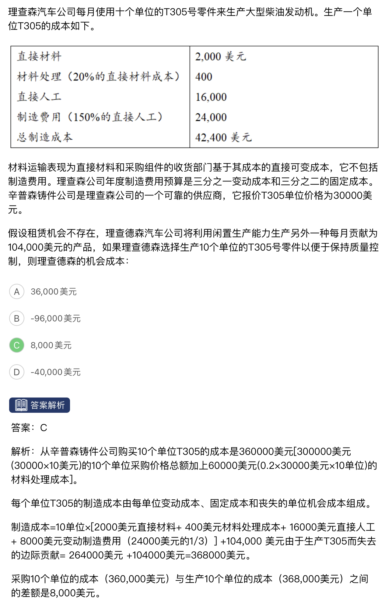 ①购买时是采购价。生产消耗的是料工费的金额,再加上如果购买的话的机会成本。②题目中“材料处理(20%的直接材料成本)”,购买一件的成本是30000美元,单件的材料处理费用=0.2×30000。③因为不管生产还是不生产两种情况下的固定成本都会发生,所以就都不单独考虑了。④加的边际贡献是机会成本,就是不生产的话,这些闲置的资源会产生的收益。