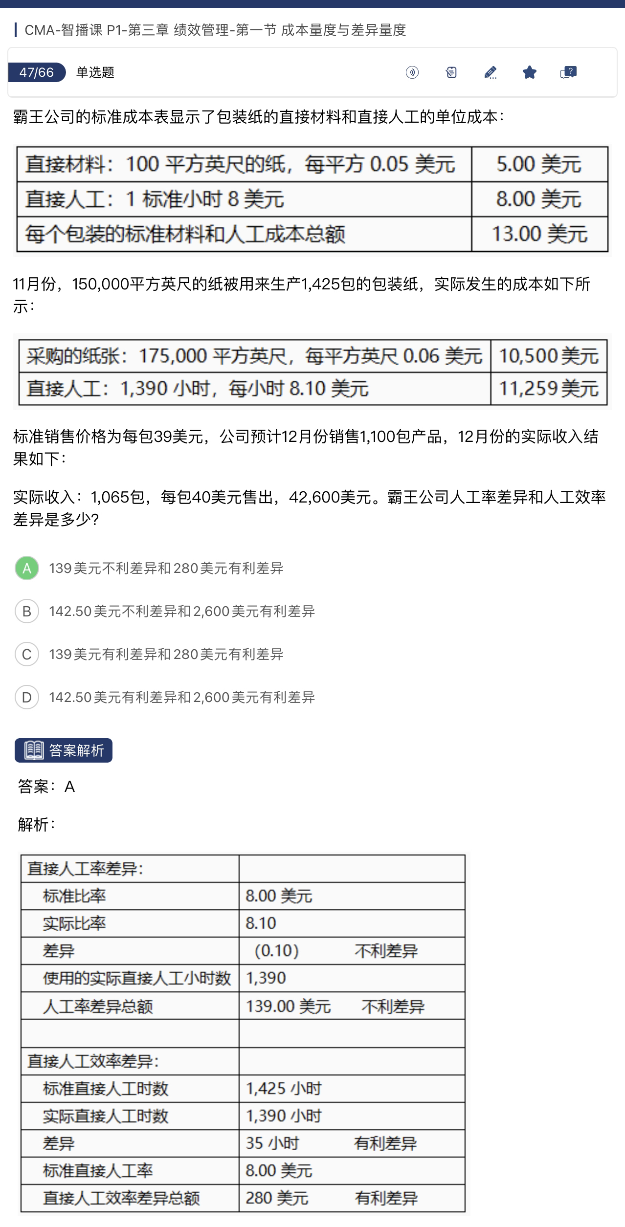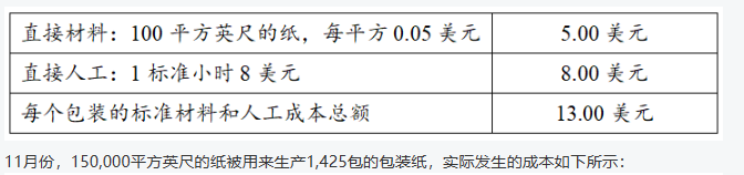 同学你好,①每个包装的标准材料和人工成本总额=13,也就是一单位产品的直接材料+一单位产品的直接人工。直接材料是5,直接人工是8,这个刚好是直接人工一单位1小时。②标准生产1425包,所以标准小时数=1425×1=1425