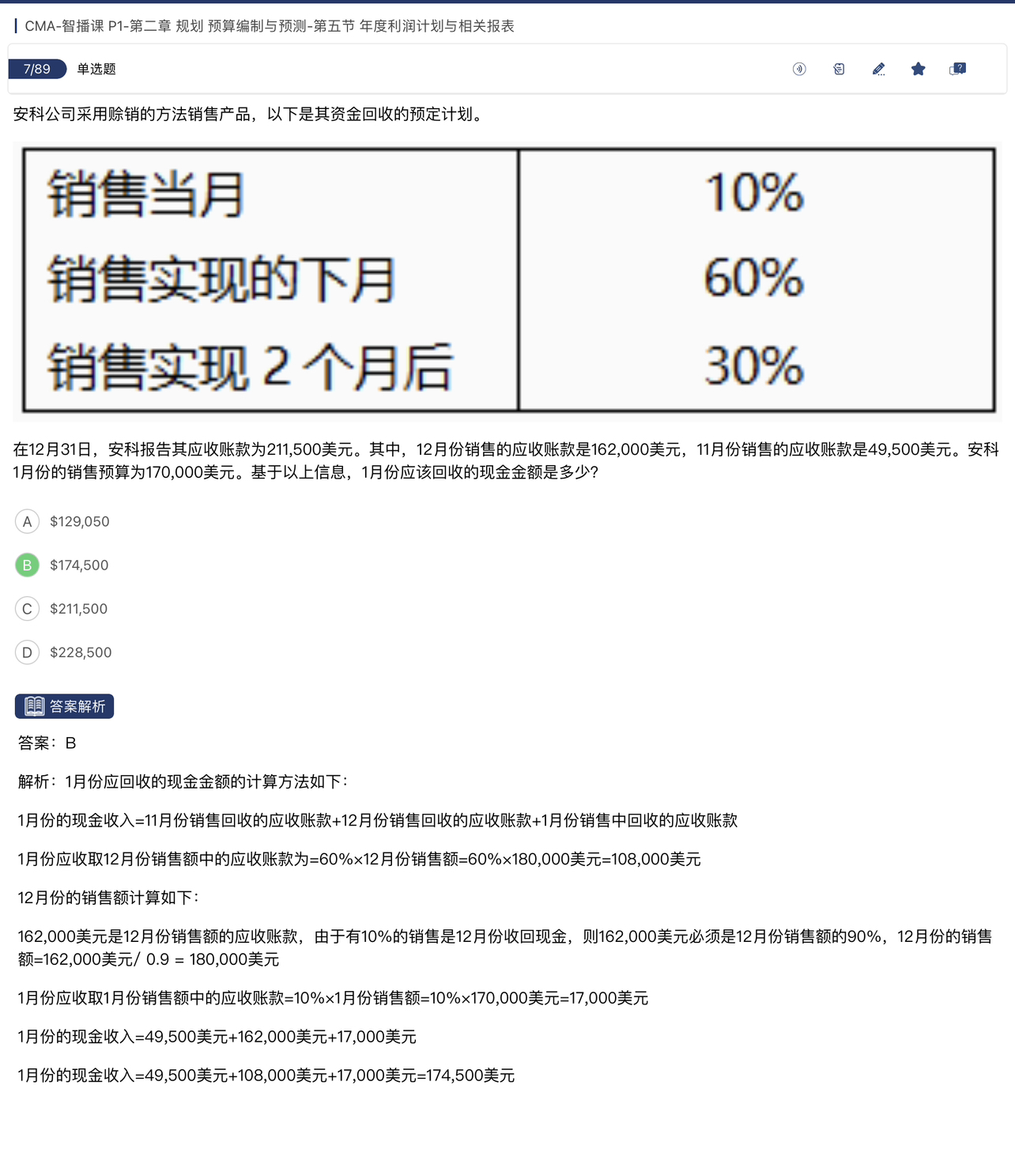 同学你好,需要注意应收账款与销售额之间的差异。11月的销售额,在11月当月收回10%,在12月收回60%,在1月份收回30%。在12月31日,11月销售额仍未被收回的款项才计入应收账款,也就是将要在1月份收回的款项,也就是11月销售额的30%。