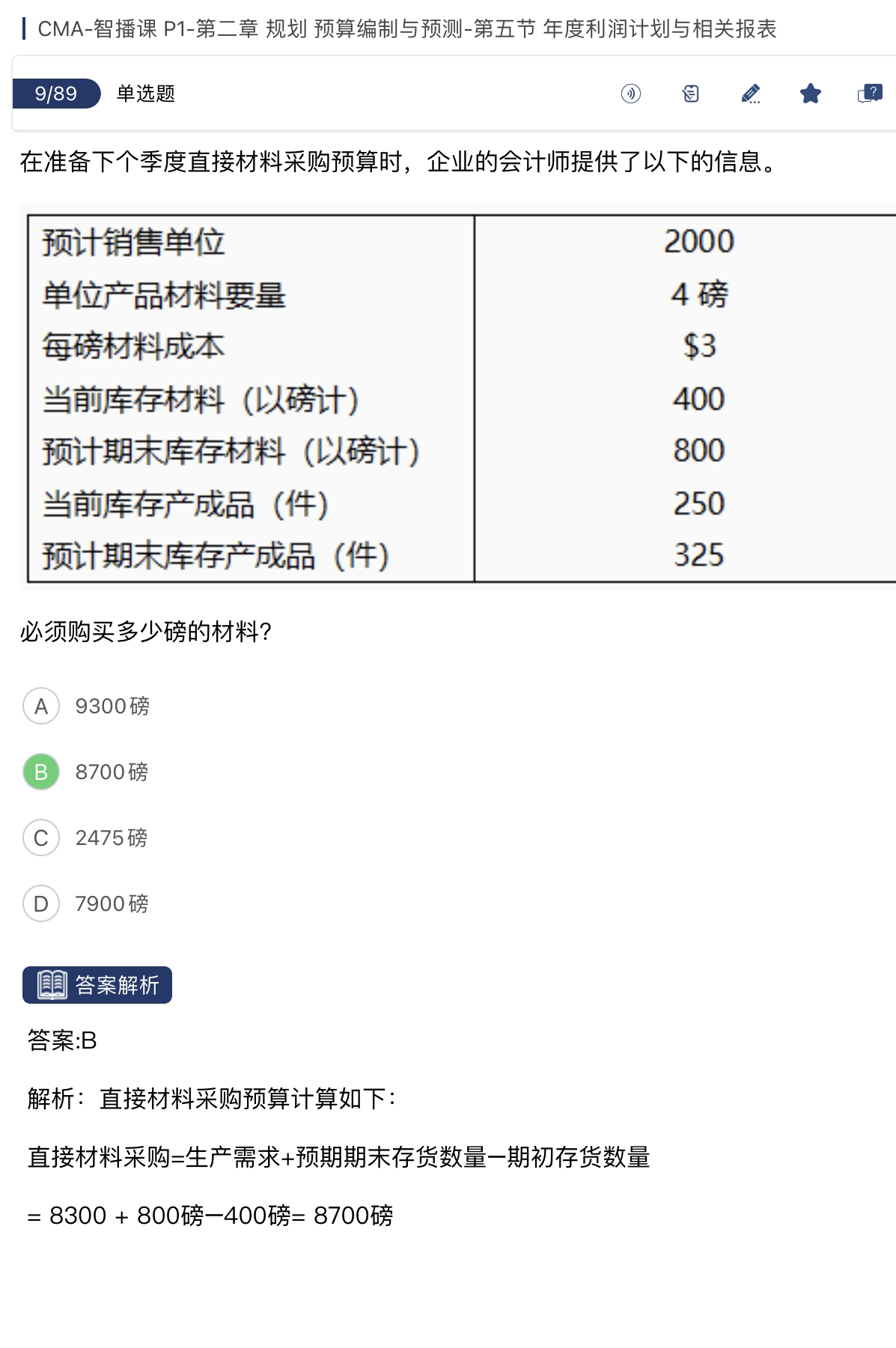 同学你好,①根据产成品,期初存货+本期增加=本期减少+期末存货。期初产成品250单位,本期销售2000单位,期末产成品325单位,所以本期需要生产的数量=2000+325-250=2075。又因为生产一单位产品需要四磅原材料,所以需要原材料的数量=2075×4=8300单位。