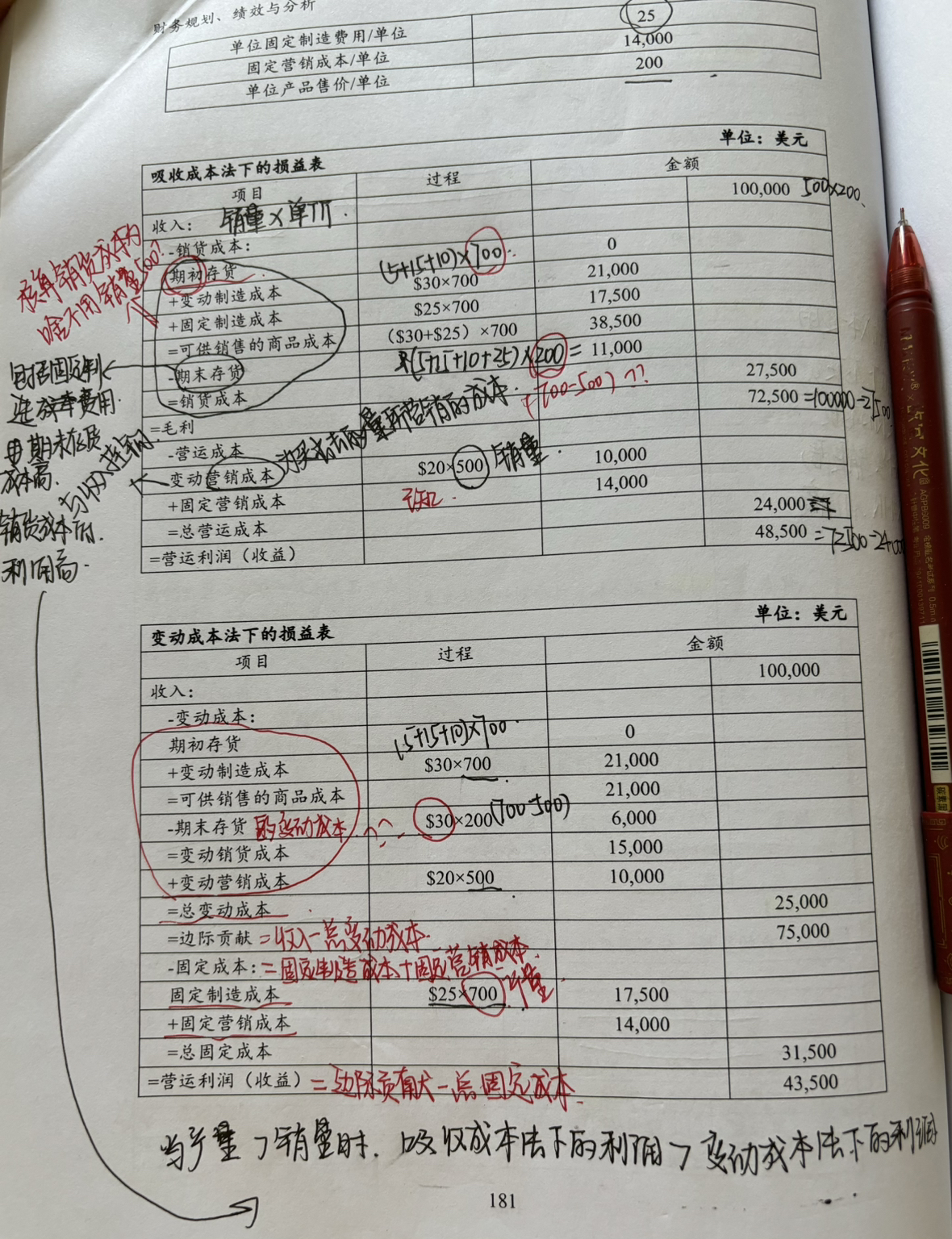 同学你好,1.计算销货成本的时候确实是单价×销量。但是这个表格里面计算的是生产成本(它等于生产数量×单位成本),它使用的是倒推的方法,本期销售成本=期初存货成本+本期生产成本-期末存货成本。所以使用的是产量。2.变动成本法下,存货成本包含直接材料,直接人工和变动制造费用。这个30指的是上述三项的合计数。200是因为期末存货的数量是200