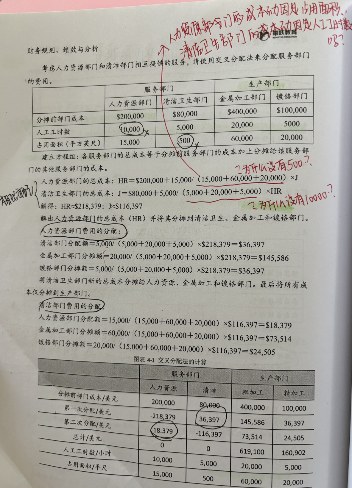 同学你好,①交互分配法,因为不需要计算自己分配给自己多少成本。②人力资源总成本=分摊前的成本+清洁部门分摊给他们的成本,清洁部门的分摊基数是清洁面积。清洁卫生部门总成本=分摊前的成本+人力资源分摊给他们的成本,人力资源分摊基数是人工小时