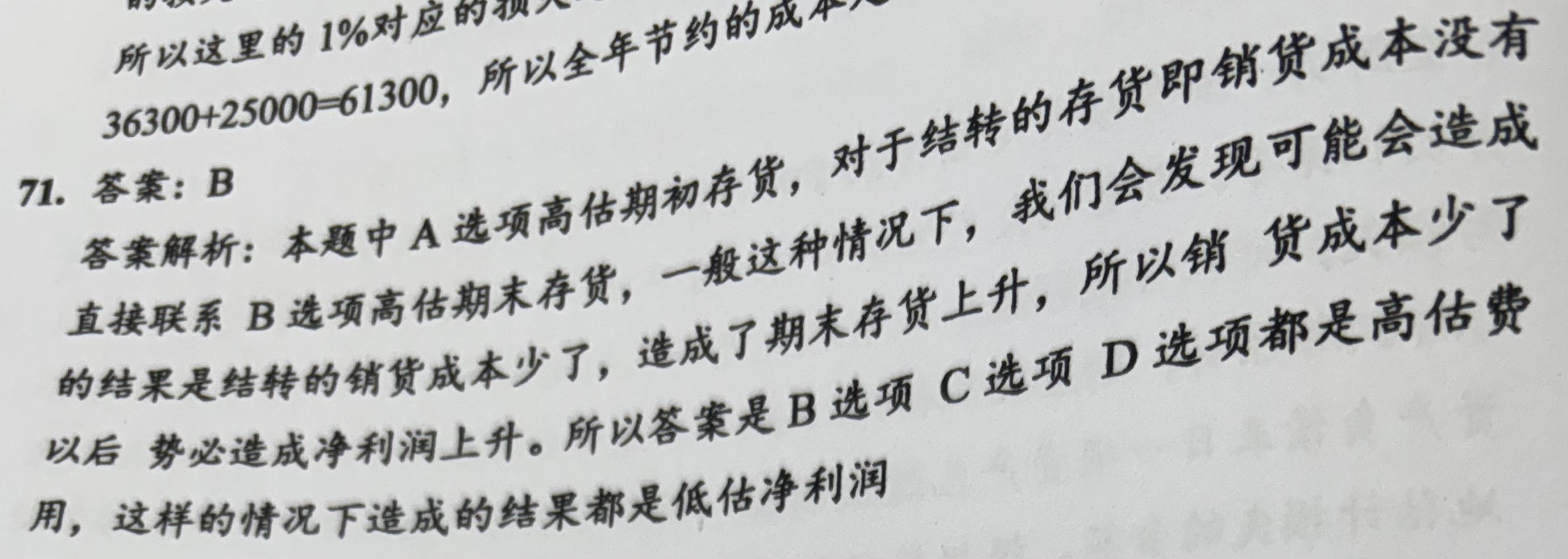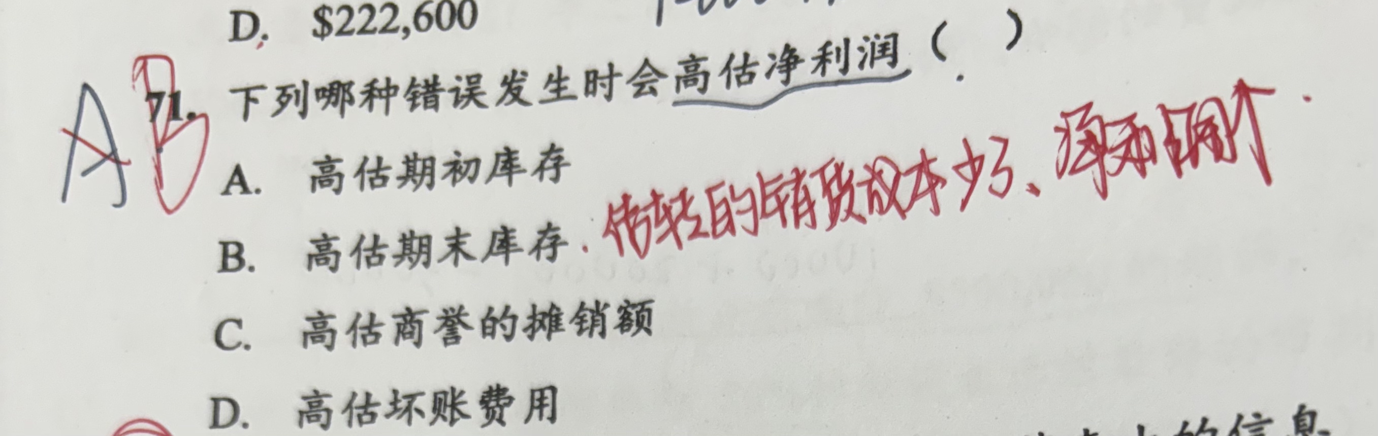 同学你好,这道题目问的是什么情况下高估净利润,那其实也在问什么情况下会高估收入或者低估成本。A选项:我们知道会计恒等式:期初库存+本期增加=本期减少+期末库存。高估期初库存,如果其他项都保持正确的话,那么“本期减少”也就是销货成本会被高估,所以会低估净利润。B选项:高估期末库存,那也就是本期结转的销货成本会被低估,所以会高估净利润。这道题目选择B选项。CD选项:高估摊销额与坏账费用,属于高估费用,在这种情况下一般是低估净利润。