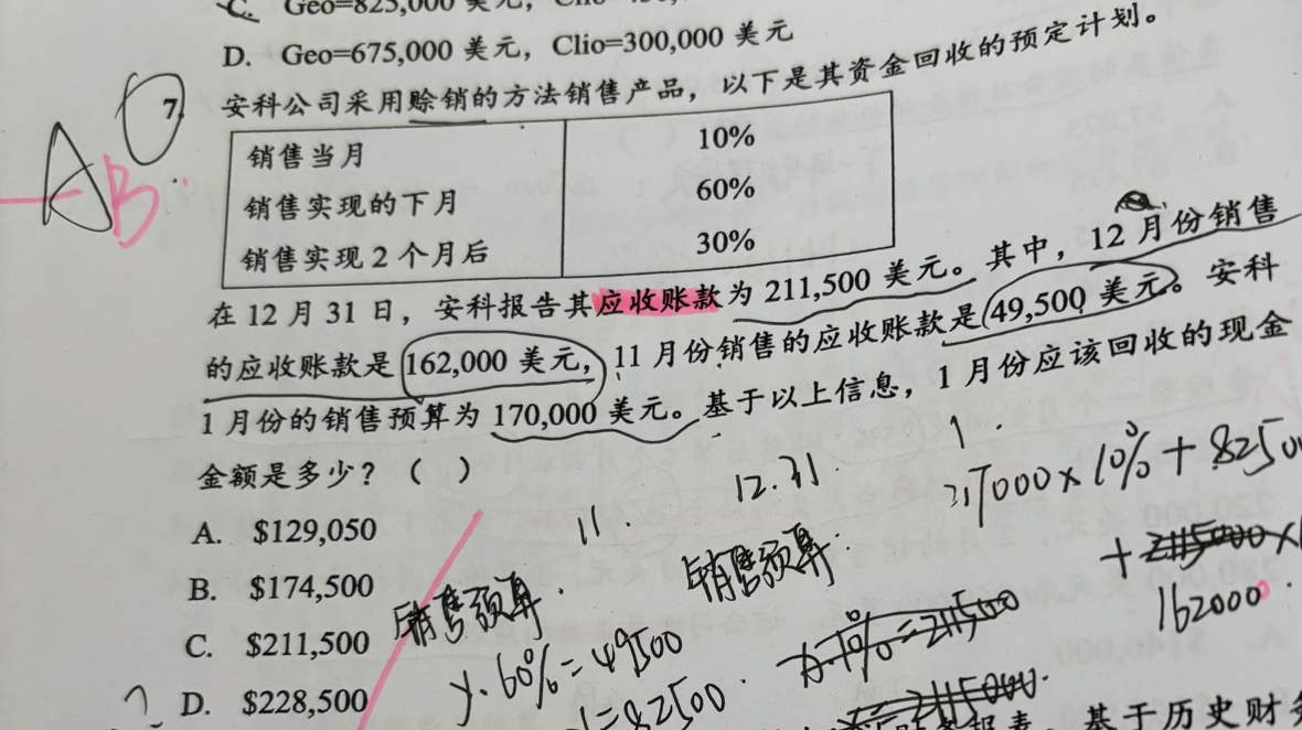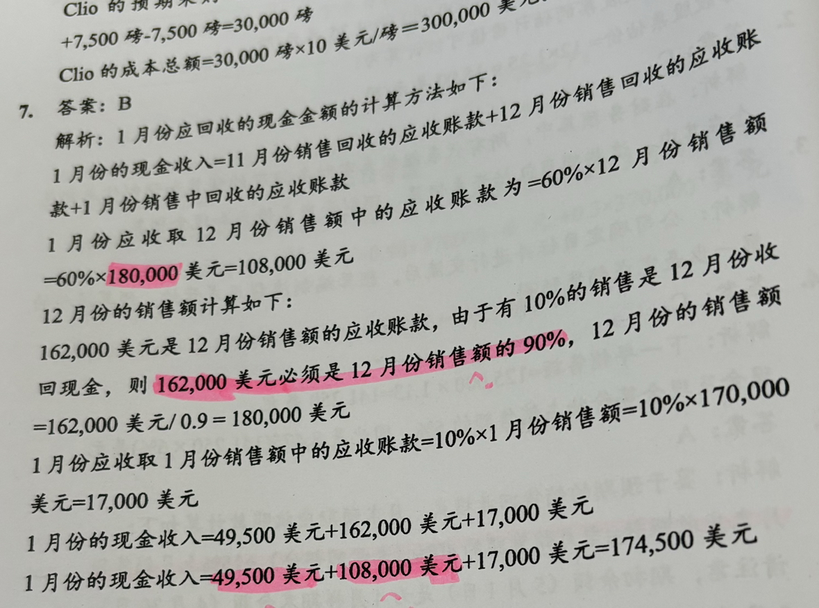 同学你好,1.12月销售额在12月可以收回10%,在1月份可以收回60%,在2月份可以收回30%。在12月31日的时候,12月销售额还没有收回的部分,就是将要在1月份和2月份收回的部分=60%+30%=90%。2.11月销售在11月当月可以收回10%,在12月份可以收回60%,在1月份可以收回30%。所以在12月底还没有收回的部分计入应收账款科目,此款项是可以在1月份收回的,所以直接加上。3.这道题目其实需要注意的点在于“应收账款”。需要判断是哪个月没有收回的款项。