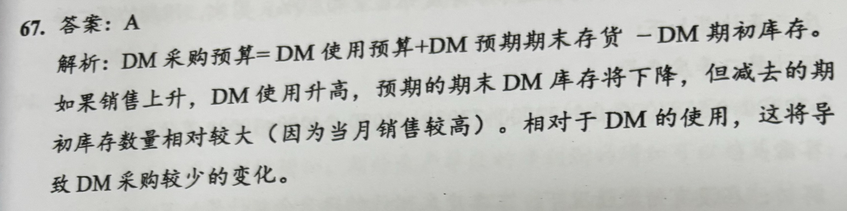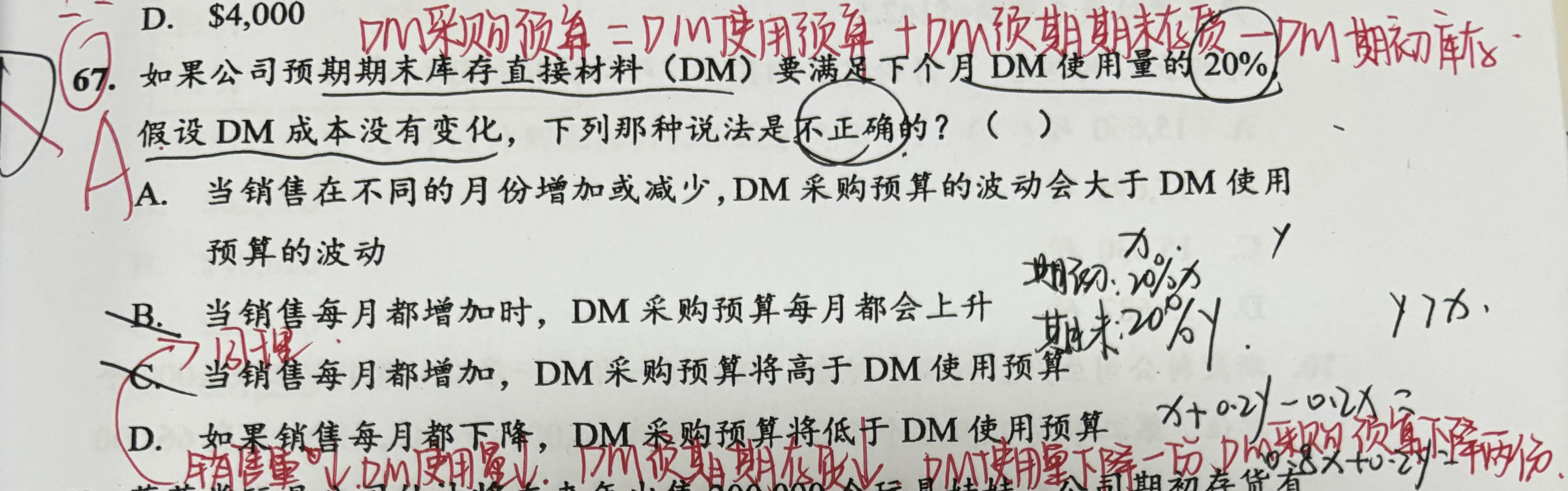 同学你好,①DM采购预算=DM期末库存+本期使用量-期初库存,联系上题干中给到的信息,DM的采购预算=下个月DM使用量×20%+本期使用量-本期使用量×20%=下个月使用量×20%+本期使用量×80%。②A选项:当销量增加和减少是交替发生的时候,因为有期初库存与期末库存量,所以DM采购预算的波动是小于DM使用预算的波动的。相当于库存能对波动启到缓冲的作用。B选项:销量多了,需要采购的数量也多了。C选项:DM采购预算-DM使用预算=(下个月使用量-本月使用量)×20%,销量本月增加,那也就是下个月销售量大于本月销售量,所以DM采购预算数量大于DM使用预算数。D选项:跟C选项的解释是一样的。