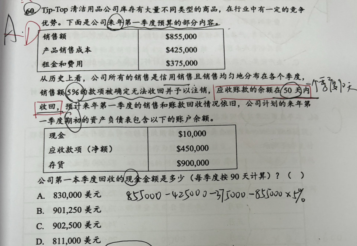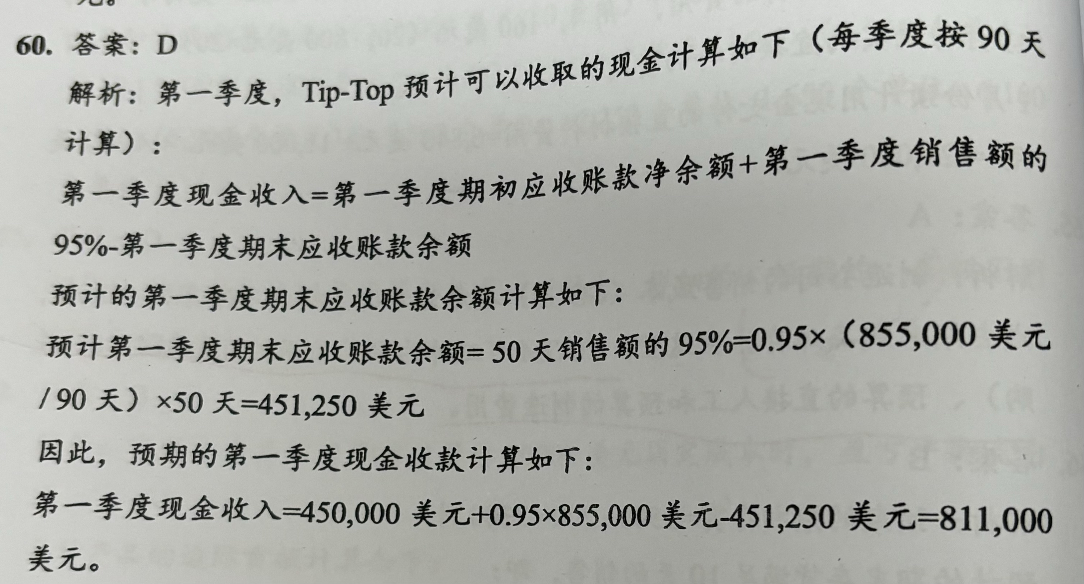 同学你好,①因为有5%是无法收回的,属于坏账,所以乘以的是95%。②因为题干信息:公司所有销售都是信用销售且销售均匀的分布在各个季度。所以假设销售是均匀分布在每一天的。“应收账款的余额在50天内收回”,那所以第一季度能收回的是前40天的销售。