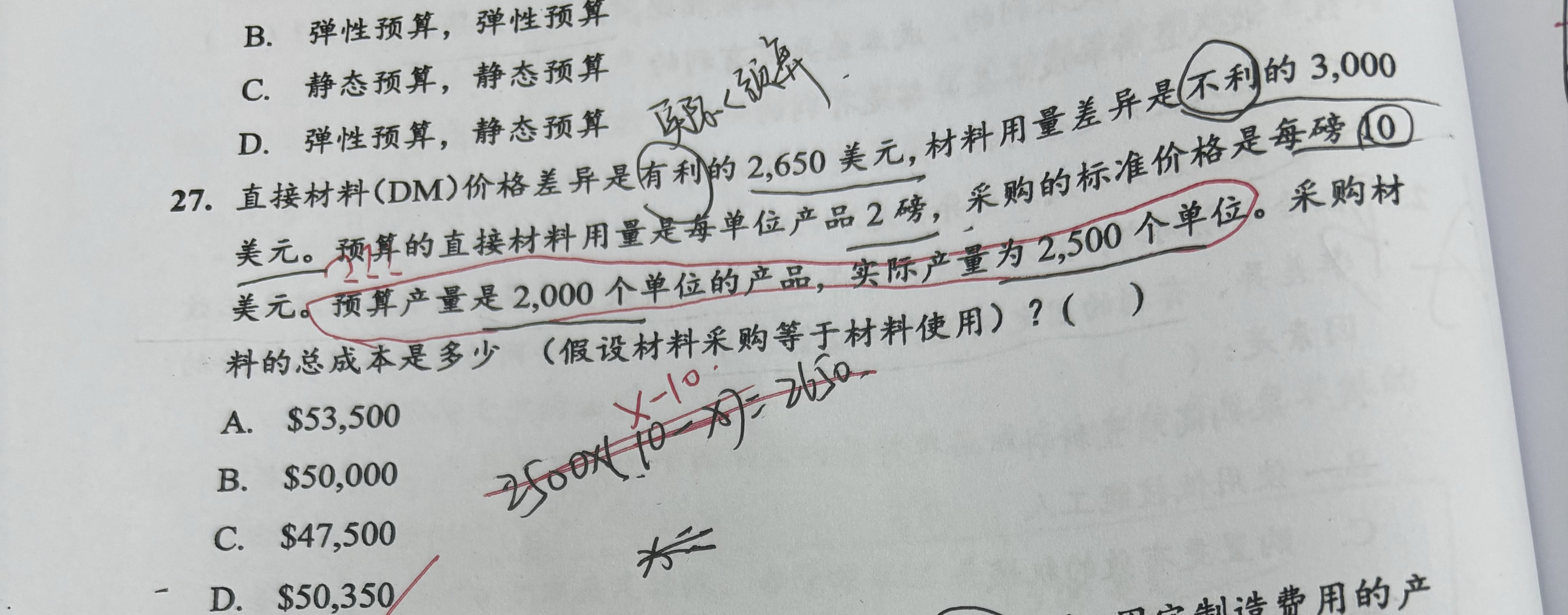 同学你好啊,①直接材料的价格差异=实际材料量×(实际采购价格-预算价格)=-2650,因为题干中得到信息,材料采购=材料使用。现在知道预算标准价格是每磅10美元,所以目前需要求的两个是:实际材料使用量和实际采购价格。②再来看:直接材料用量差异=(实际使用量-实际产量下的标准使用量)×标准价格=3000,其中标准价格=10,实际产量下的标准使用量=2500×2=5000,所以实际使用量=5300。③接着,倒回到上一步,相当于:5300×(实际采购价格-10)=-2650,计算得出实际采购价格=9.5。④所以:采购材料的实际总成本=实际采购量×实际单价=5300×9.5=50350。⑤记得在微信群里回答过,上面那些是解答步骤哦,如果哪里不懂,继续沟通。