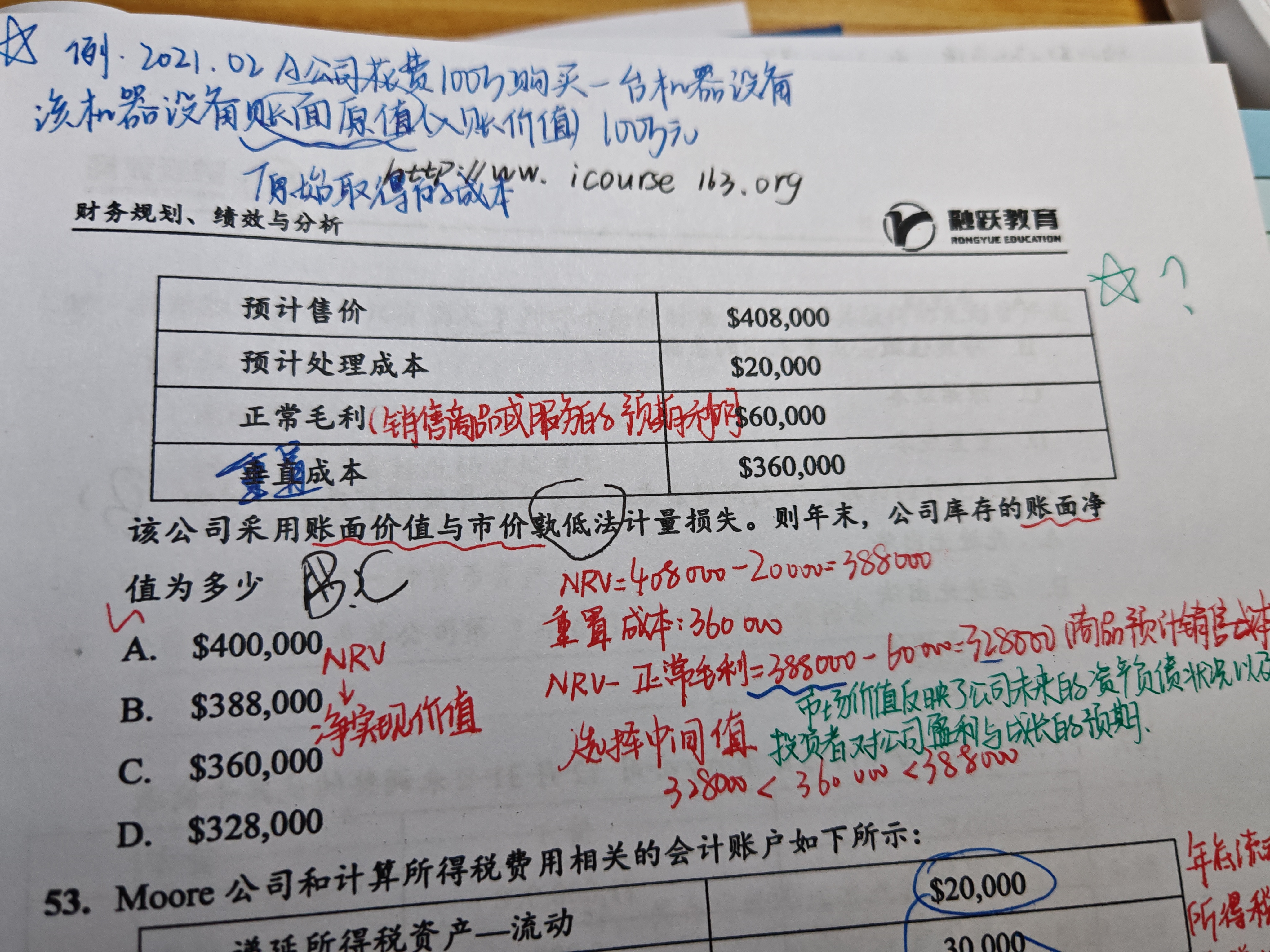 这种题我看你记得笔记太复杂啦,我们再梳理一遍。 市价的确定一般就是重置价值360000。然后与成本(一般题目要已知,这题不太标准,没有告诉), 然后市价和成本取低的就可以。 特殊要求是: 没过准则规定重置价值不能太高也不能太低,所以多了个市价上限(NRV)和市价下限(NRV-正常毛利)的区间约束,但CMA基本没有考核这个点。