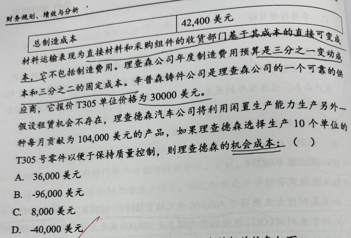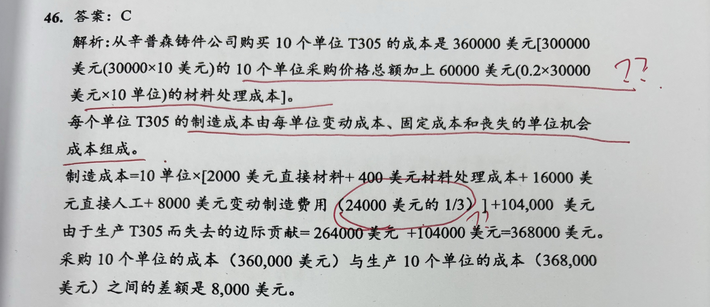这是一个自制还是外购的问题: 外购成本除了采购加,还考虑了材料处理费用 (这个确实题目没有明确,容易忽略。) 题目中小括号的条件”20%的直接材料成本“, 意思是只要有材料成本,就要考虑这个材料处理费用。 自制成本中,我们只需要考虑”相关成本“即可,所以1/3 的部分是可变的,要考虑进去。 不变的就不用考虑进去了。 固定成本意思是无论生产还是不生产都不变,所以不是相关成本,不考虑