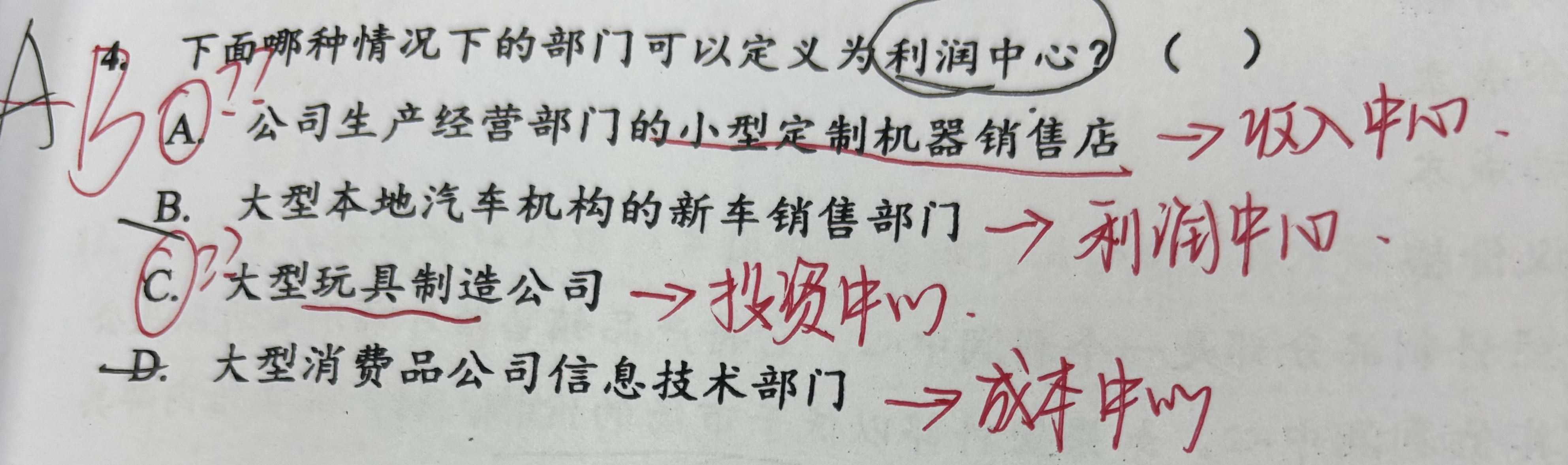 A 只是 一个” 销售店“,而且强调小型,只负债销售收入,判定收入中心。 C 是一整个公司,有销售,成本, 更重要的是,有投资决策的权利,判定投资中心。(能决定某个项目是否投资)