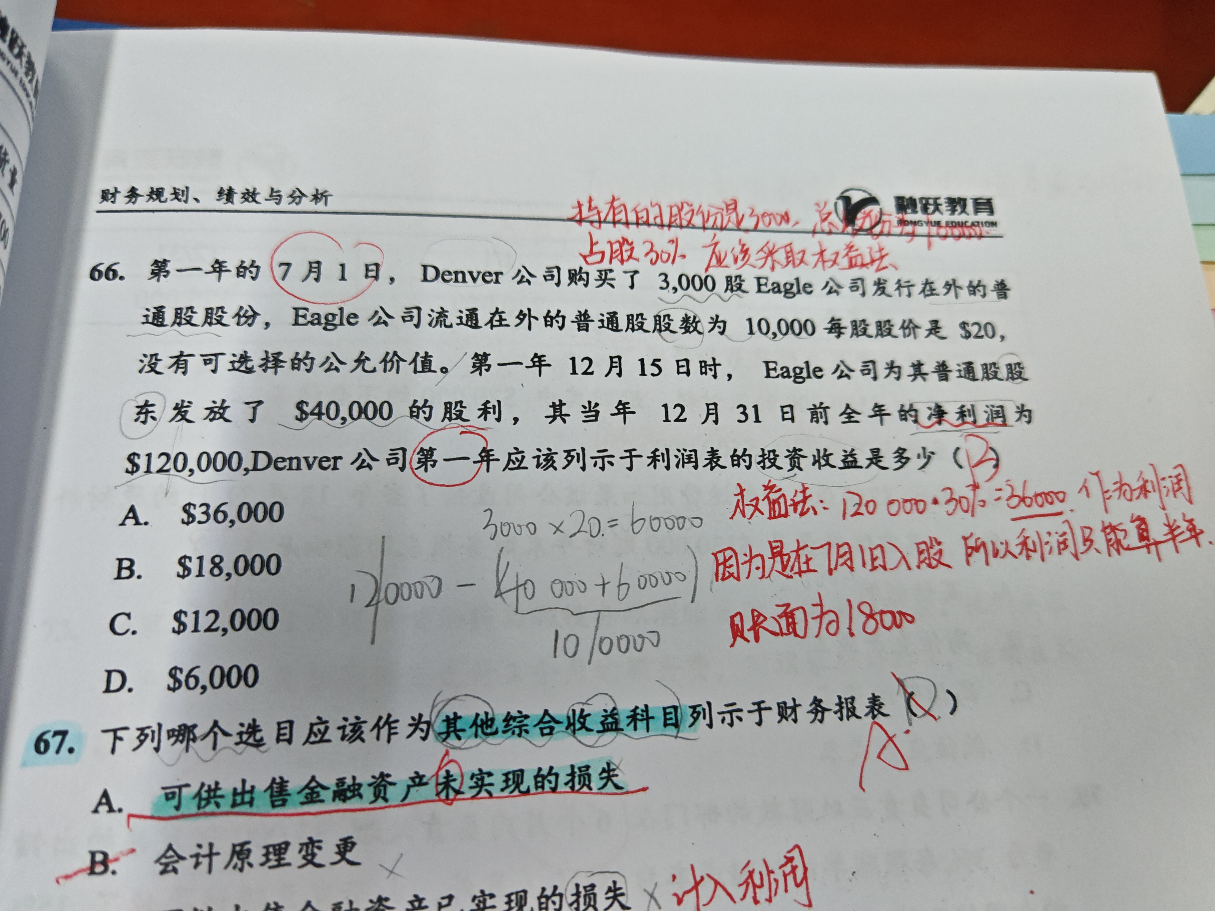 这块内容是偏向准则,所以CMA要求的不是很高。有些可以为了考试先记下来。 本题投资占比30%, 确定是权益法; 再看问题是要投资收益, 那权益法下,被投资单位的利润分成记在投资收益里(这里是准则规定),所以120 000 * 30% *0.5 半年