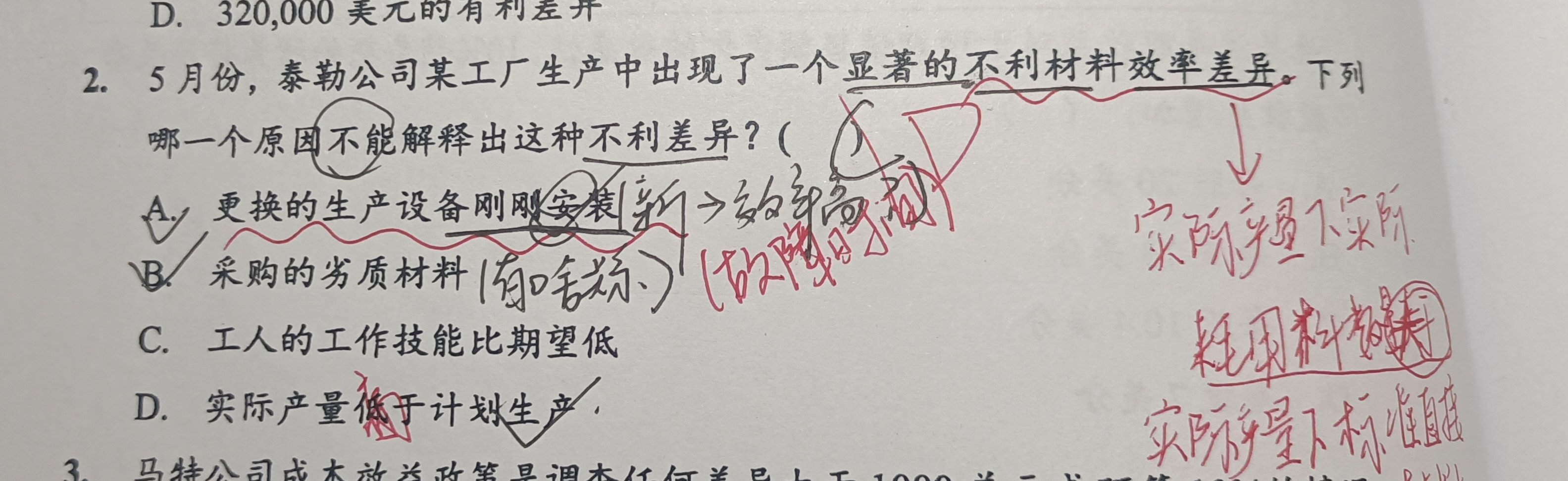 不利的材料效率差异,说明是实际耗用量多了。 A 是刚卖了新的设备,刚安装,容易出故障,浪费材料。 (确实有点牵强。) 但D ,你的笔记也不太对,我认为是不相关的。 因为材料的效率差都是基于实际产量的,与计划产量无关。这才选D