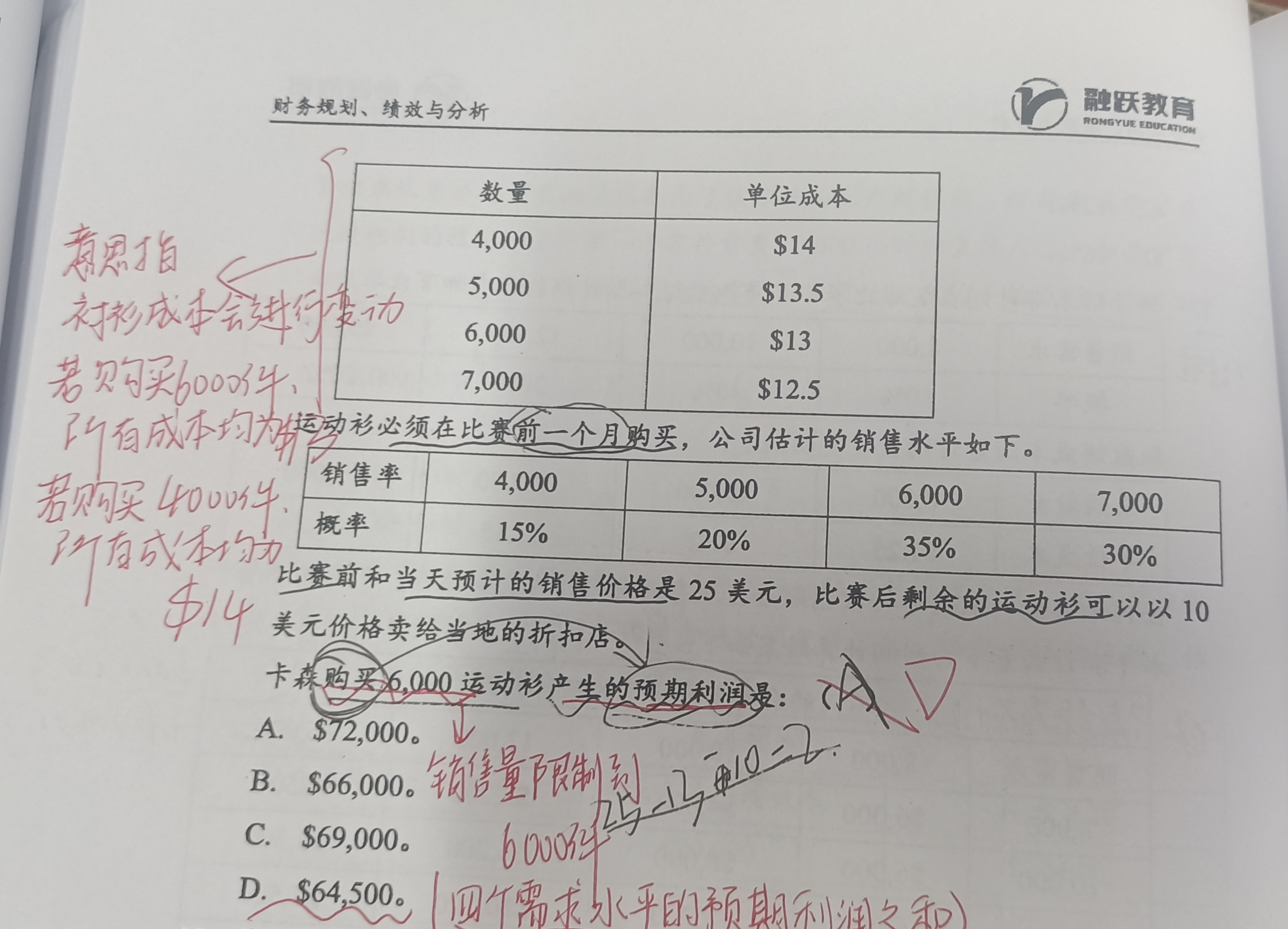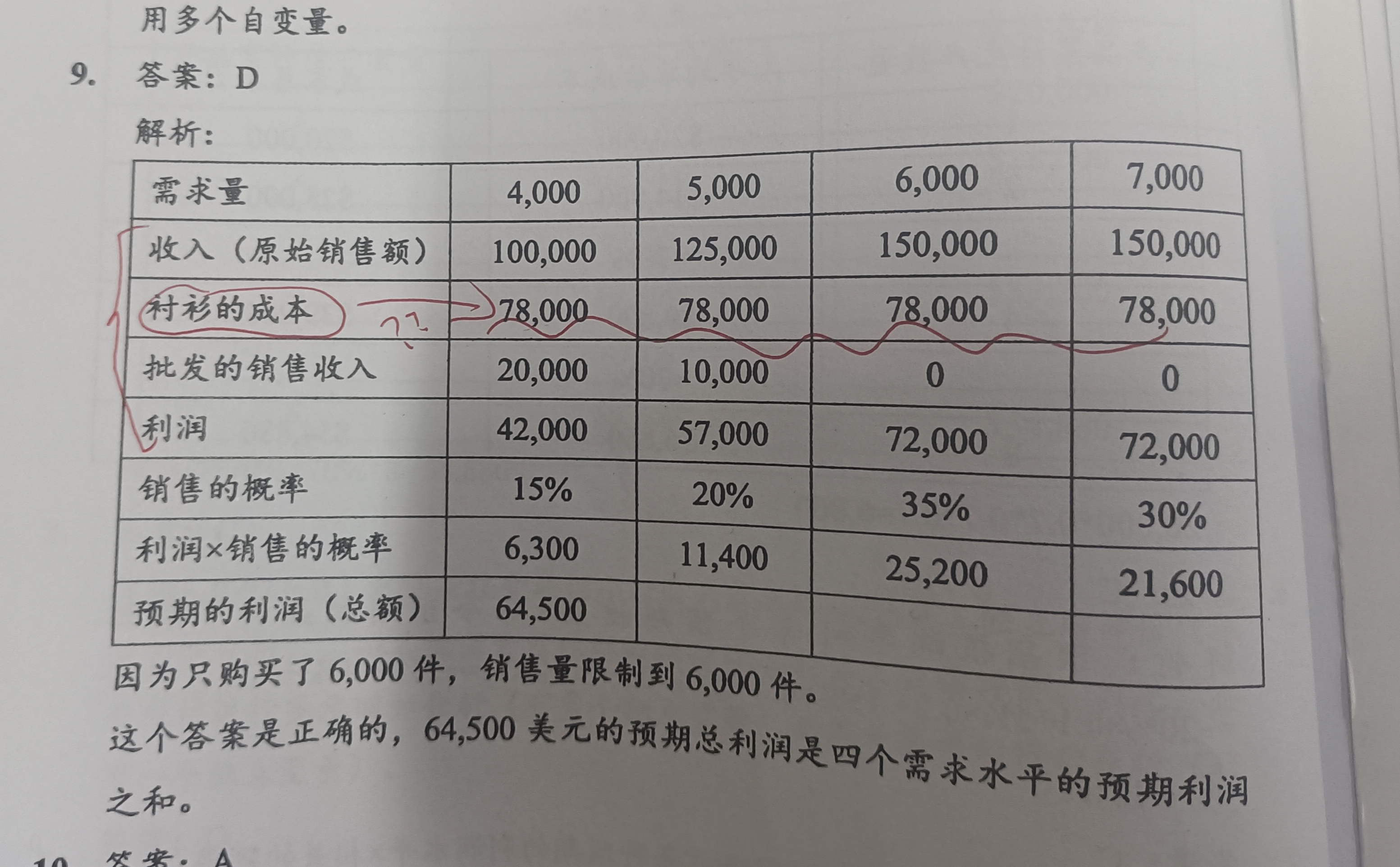 本题的思路是: 如果进货6000, 卖出去4000, 那就是剩下2000 卖出去的4000产生的收入: 4000* 25=100 000 进货6000的成本: 6000*13 =78000 ( 看表,那个表的意思是,如果进货6000, 就可以13元成本拿货) 剩下的2000可以便宜卖掉: 2000*10 =20 000 所以利润是42000。 其他依此类推 每种情况的利润 * 相应的概率 ,最后就得到预期利润了