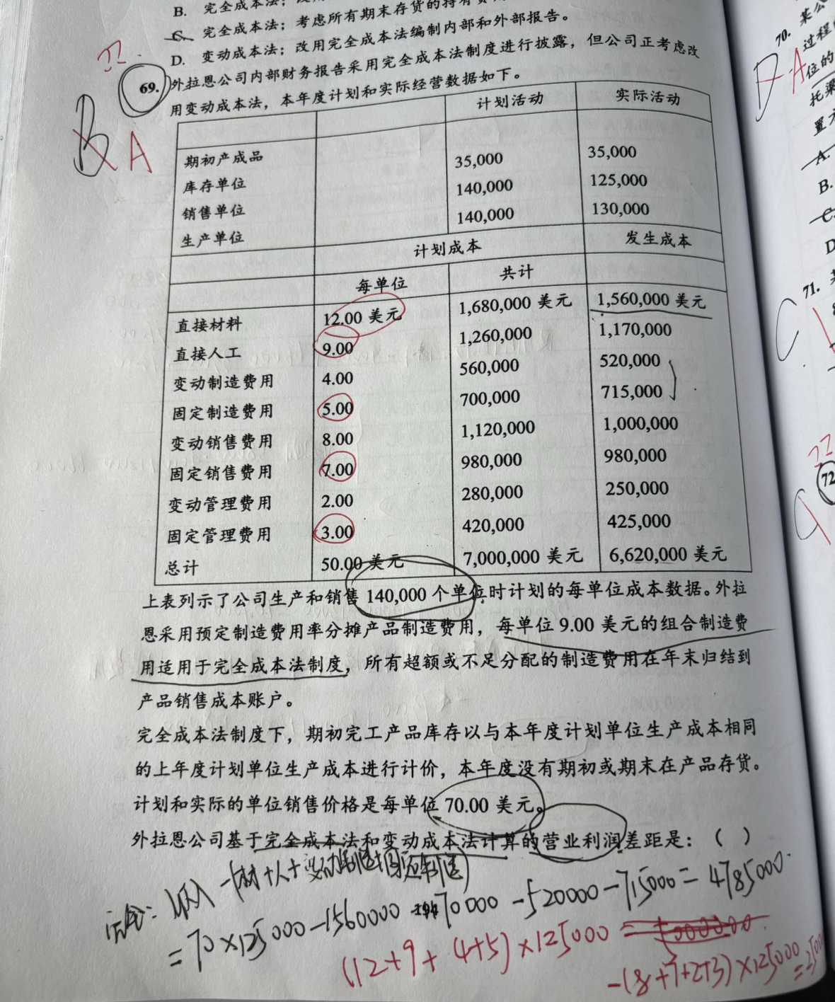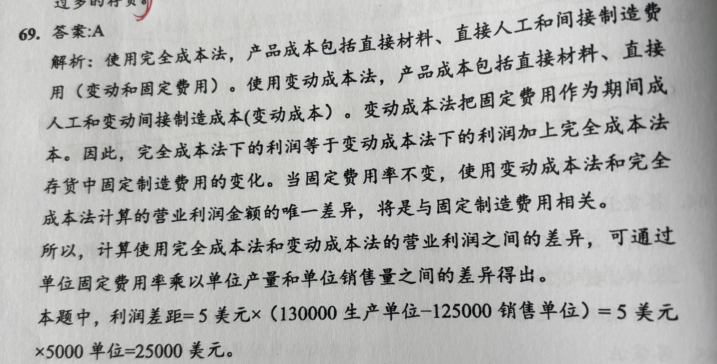 这个弄的太复杂了。这个就是固定的 (产量 - 销量) * 单位固定成本。 一下字就算出来了。 这两个方法其他方面对利润的影响都是一样的,只有这个产销量的差值里包含了单位固定成本