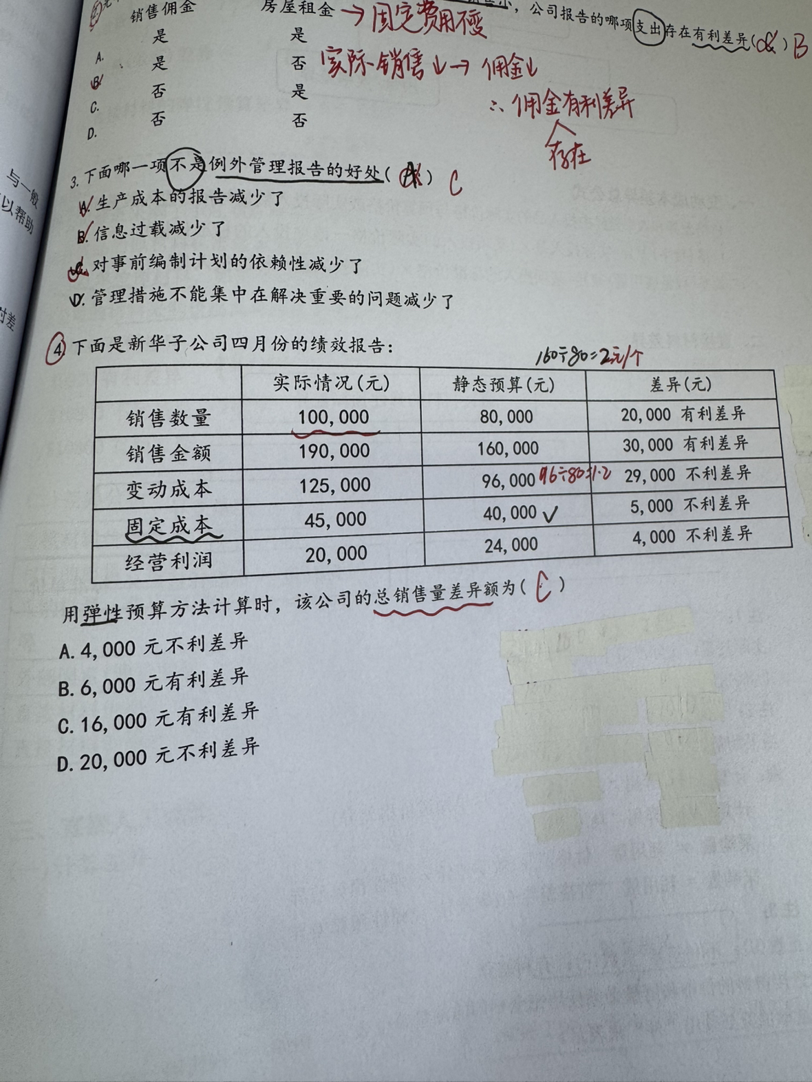 销量差异 = (AQ -SQ )* 标准利润 = (100 000 - 80 000 ) * (24000/80 000 ) = 6 000 有利 所以本题应该选 B 从本题问题看,只需要算出量差即可, 不用算别的了。