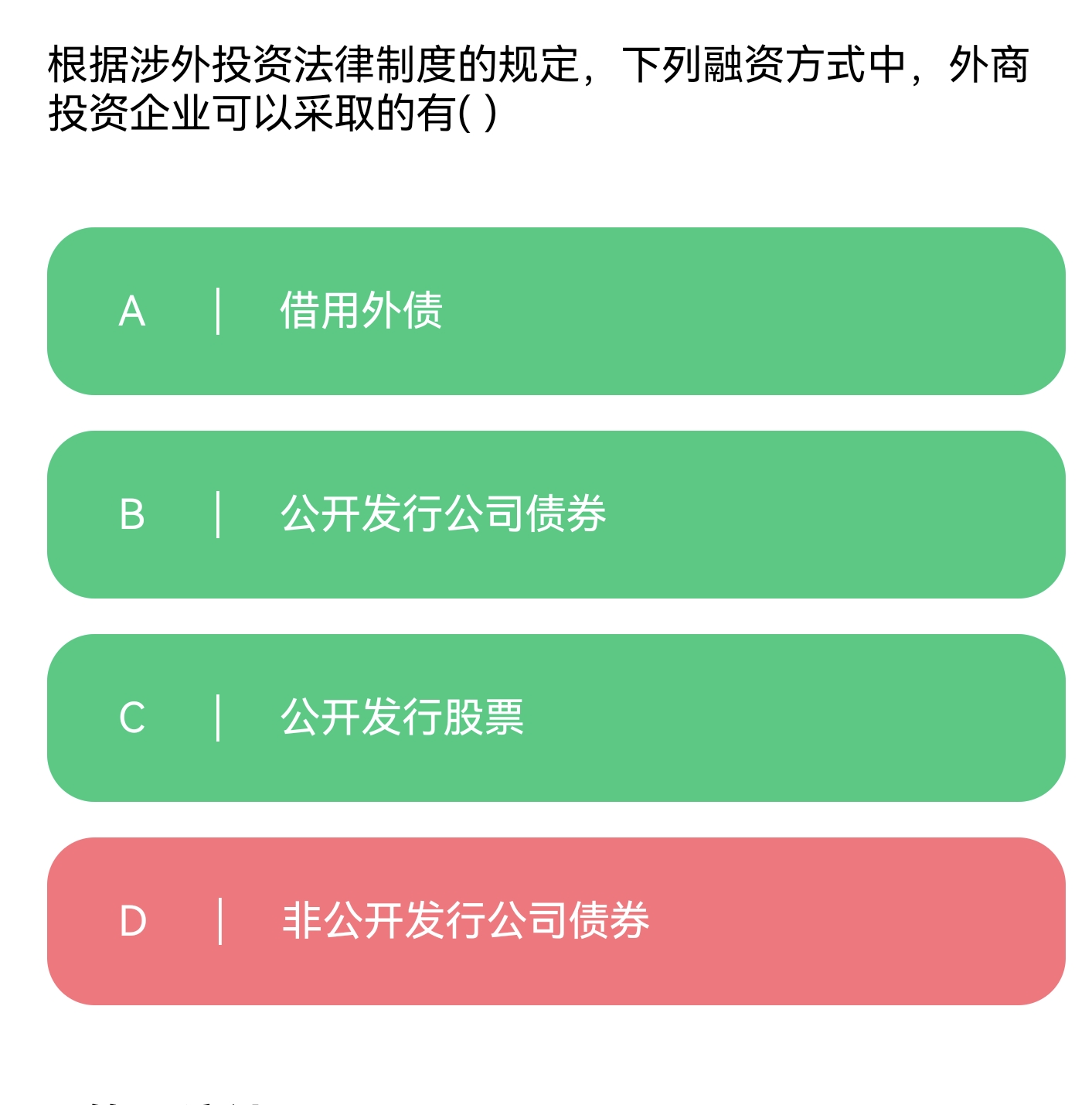 答案ABC是教材的教材原文表述,记忆一下就好。D选项的教材原文表述是,非公开发行其他融资工具,和不等同于 “非公开发行公司债券”。前者涵盖范围更广(如私募债、定向融资工具等),而 “非公开发行公司债券” 需严格遵循《公司债券发行与交易管理办法》,其对发行人的 “公司制” 要求(如需为有限责任公司或股份有限公司),可能排除了 “非公司制外商投资企业”(如中外合作经营企业中的非法人形式),因此认为 D 并非所有外商投资企业均可采取的方式。