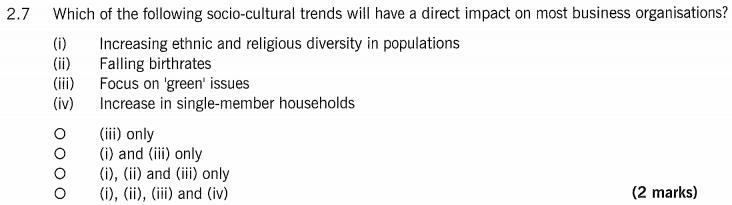 题目里有2个题眼 第一direct impact 和most business 前3个相对于第四个来说是面对大多数企业。最后一个相比前3个影响的企业比较少,1影响的就是大多数企业的人力资源部门,这对他们面试人员的时候考量就增多了,第二个出生率降低可能导致老龄化比较严重或者是我们需要用员工的时候这部分出生率低的时候的 员工比较少,那我们市场需求多那可能也有很大的影响,第三个是环境影响 环境是肯定影响大多数企业,只有第四个增加单身家庭数量,只会对关注单身的企业有影响不关注单身的企业不受影响