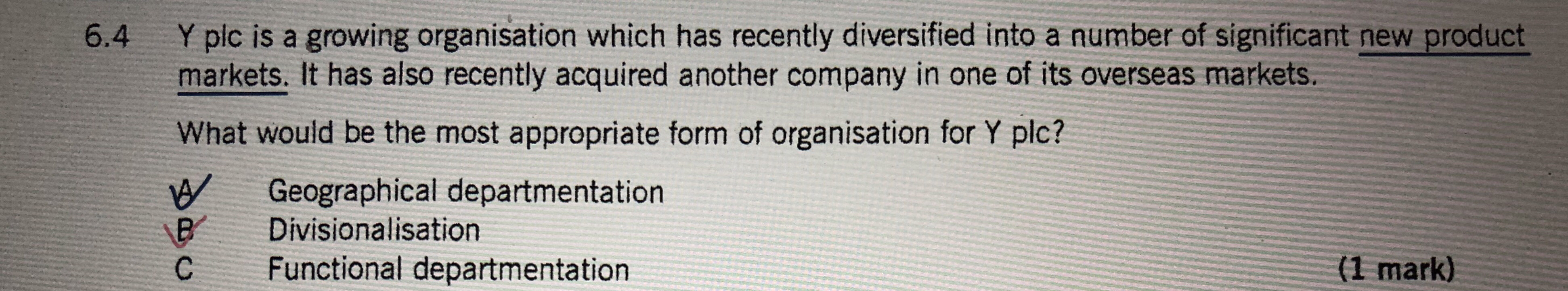 因为Y公司首先它diversified 很多不同的产品市场,然后他最近又收购了一个海外公司,就是分部管理体制(divionalisation)的战略,这个公司有一个海外的分部同时又有许多不同的市场。