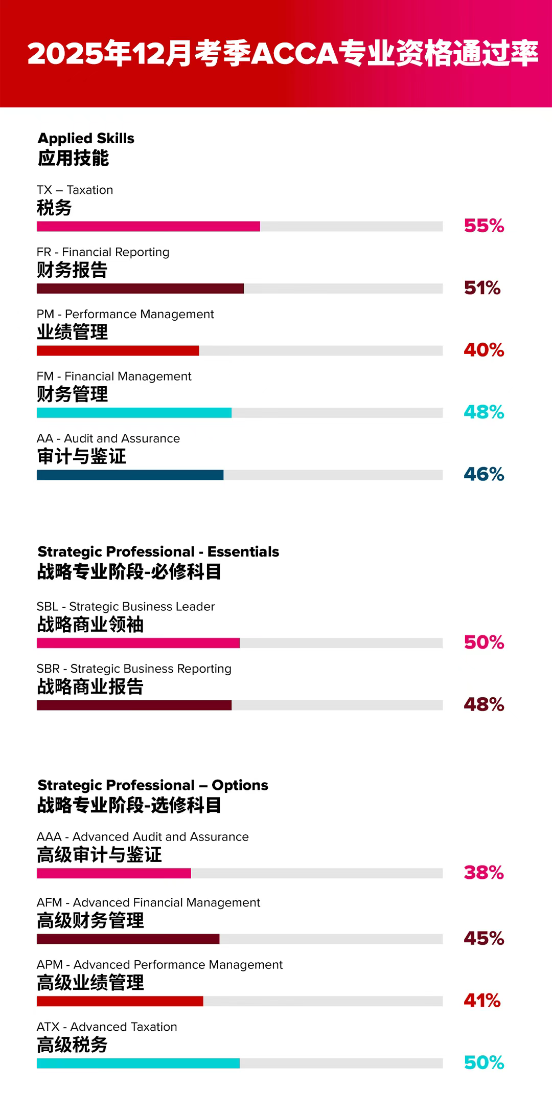 ACCA(特许公认会计师公会)现已公布2025年12月考试季的通过率。