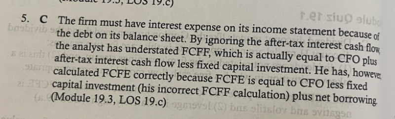 答案是没有问题的,如果是从CFO角度计算FCFF,公式是FCFF= CFO+ Int× (1-T)- FCINV,如果少考虑了Int× (1-T),会导致FCFF被低估;而FCFE=CFO-FCINV +Net Borrowing,在FCFE的计算公式中没有利息费用的影响,所以不会对FCFE的计算造成影响。