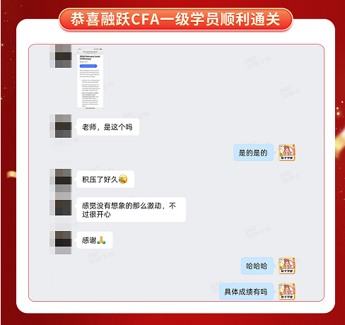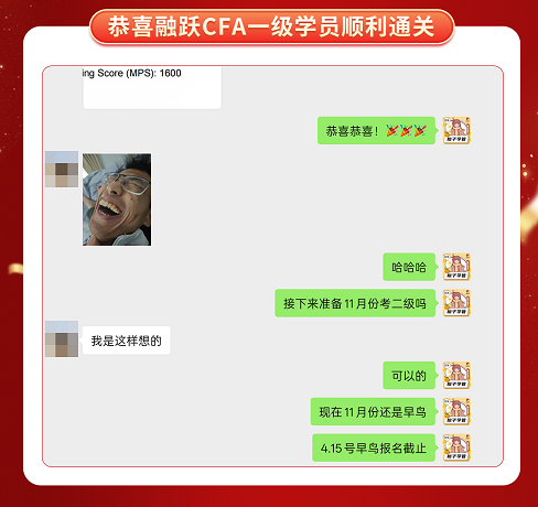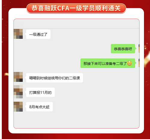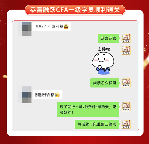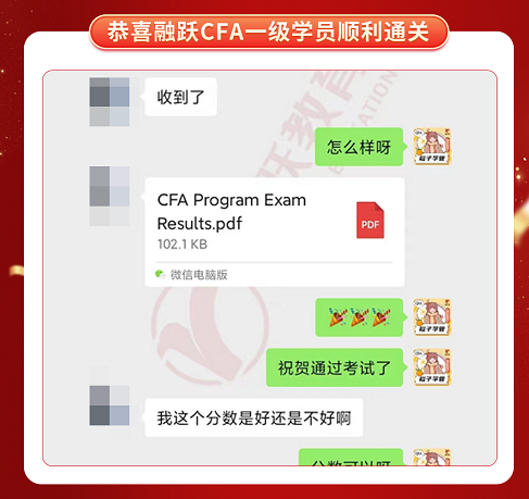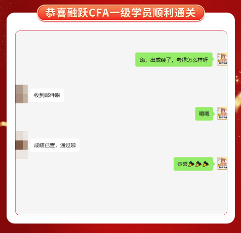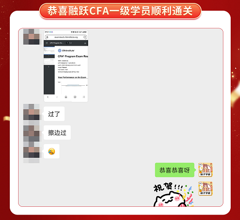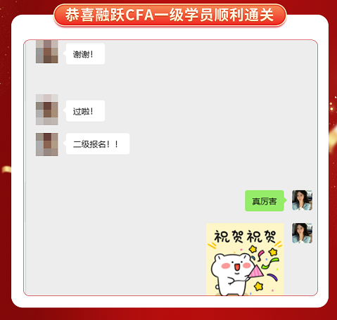CFA一级考试成绩终于公布啦,融跃教育CFA学员喜报频传,看到大家一个一个的PASS。真心为各位CFA学员感到高兴,那些熬夜刷过的题,看过的课终于都有了回报。下面我们一起沾沾喜气吧~