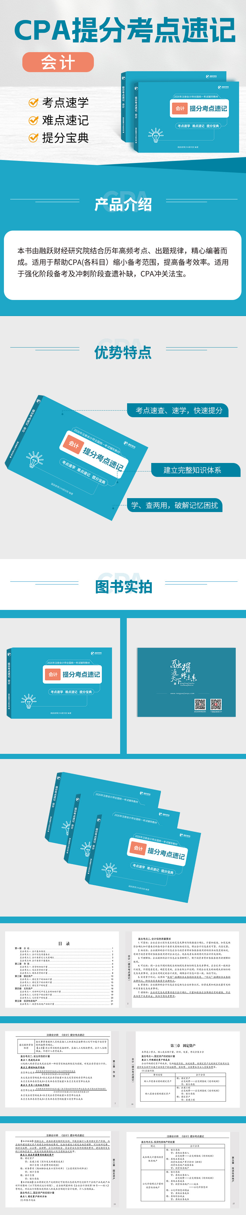 书籍简介:本书由融跃财经研究院结合历年高频考点、出题规律,精心编著而成。适用于帮助CPA考试缩小备考范围,提高备考效率。适用于强化阶段备考及冲刺阶段查遗补缺,CPA冲关利器。