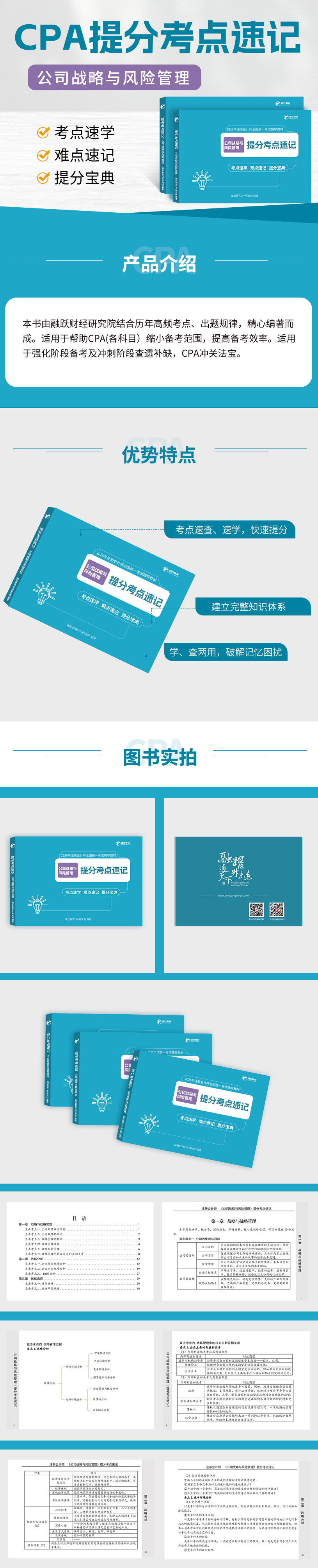 书籍简介:本书由融跃财经研究院结合历年高频考点、出题规律,精心编著而成。适用于帮助CPA考试缩小备考范围,提高备考效率。适用于强化阶段备考及冲刺阶段查遗补缺,CPA冲关利器。