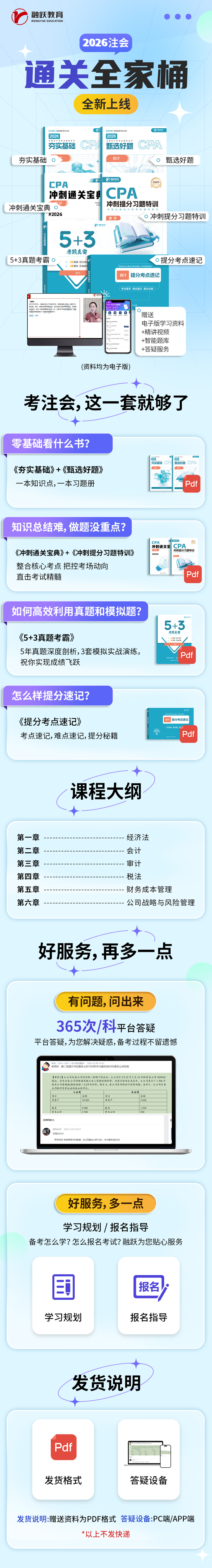 书籍简介:2026CPA通关10件套,由融跃教育CPA研究院根据最新考试大纲编著,配套精讲课程、智能题库、答疑服务以及电子版资料。涵盖基础阶段夯实基础,甄选好题,冲刺阶段通关宝典、提分考点速记,5+3真题考霸助力CPA学员快速通过考试。