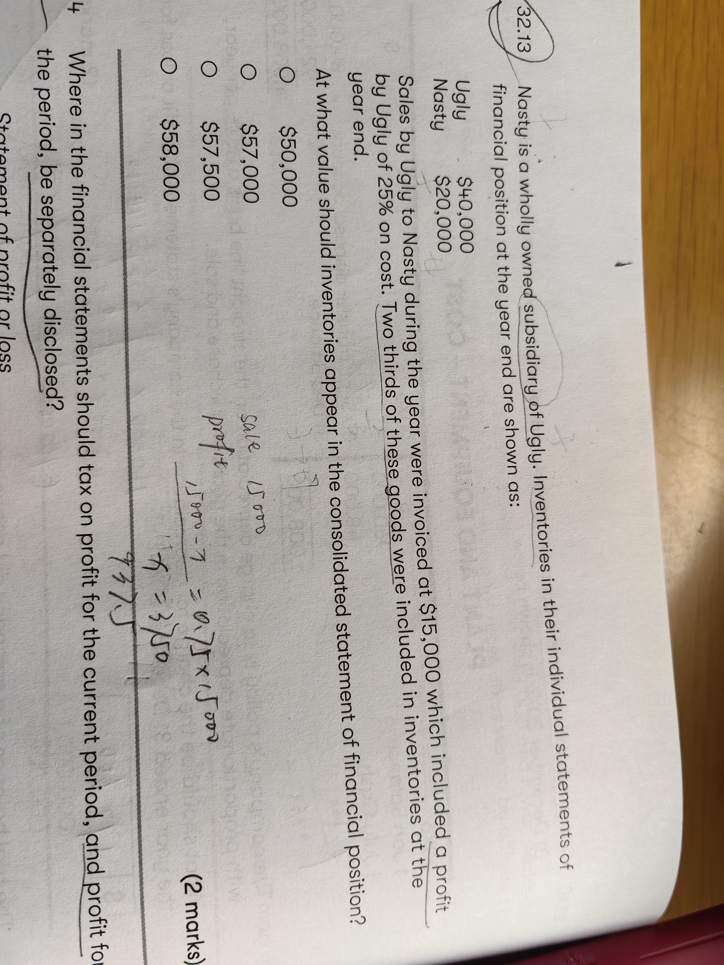 同学好,题干说的是N公司是U公司的全资子公司,即U公司100%控制N公司,本年度U公司(母公司)卖东西给子公司,销售收入是15K,销售的利润是基于cost的25%,即销售的利润=cost*25%;销售的利润=销售收入15K-销售成本cost=cost25%; 等式左边的cost移到等式右边变成,15K=(1+25%)cost,可以求出cost=12K,那么利润=cost*25%=12K*25%=3K,年底的时候存货有two thirds即3分之二的存货在报表中,即没有卖出去的存货是3分之二,因此URP未实现利润=3K*2/3=2K,又因为是母公司卖给子公司的,因此这笔调整分录为Dr retained earning(母公司) 2K, Cr inventory 2K,题目问的是在合并的资产负债表中存货的价值;那么就是母公司的存货价值40K+子公司的存货的价值20K-内部交易要调整的存货2K=58K